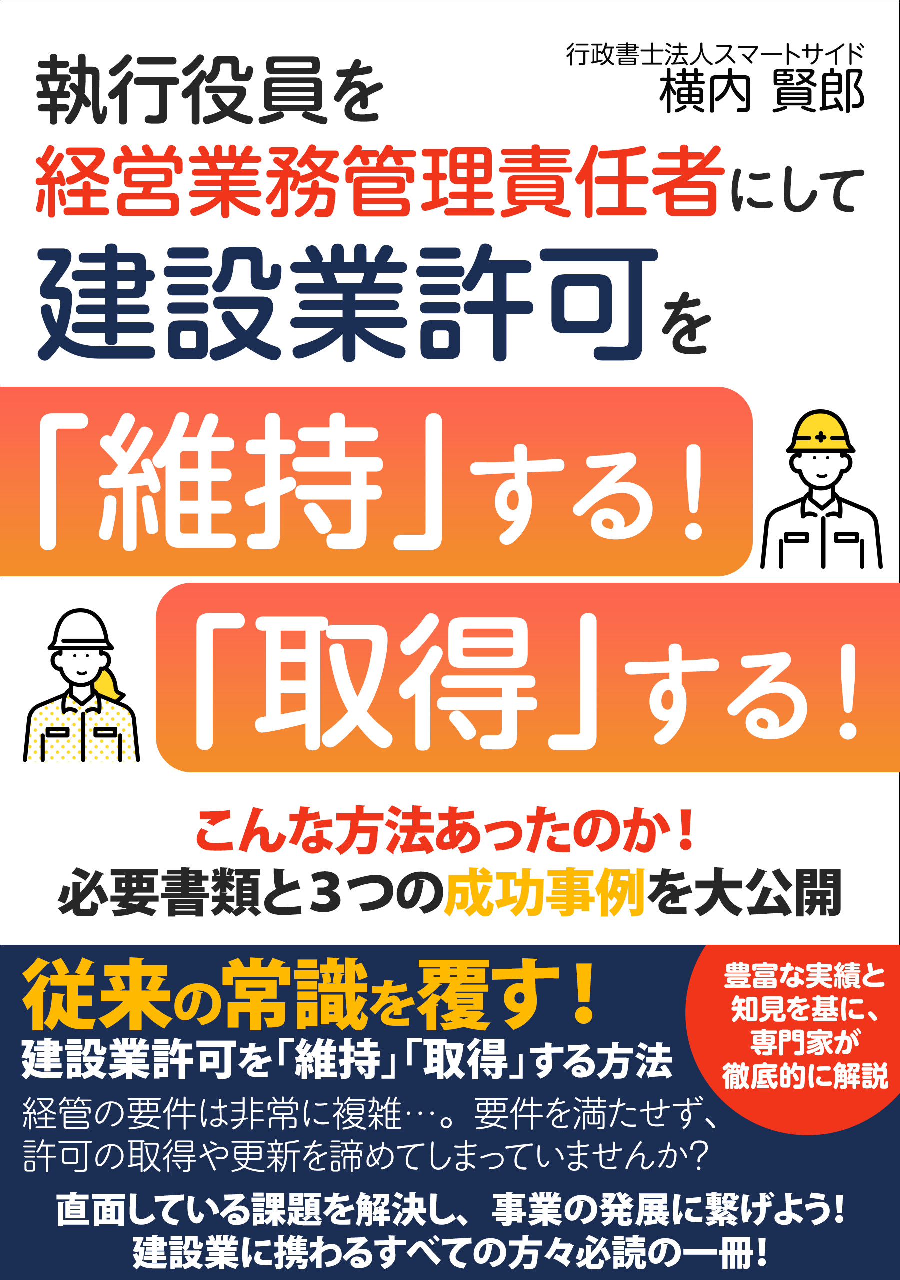 知識ゼロからでも安心して読むことができる、建設業許可取得のためのマニュアル本。建設業許可取得手続きをすぐやりたいけど、どうすればよいのか?はじめの一歩を踏み出すことができない人のために、Q&Aを用いて許可要件を解説。